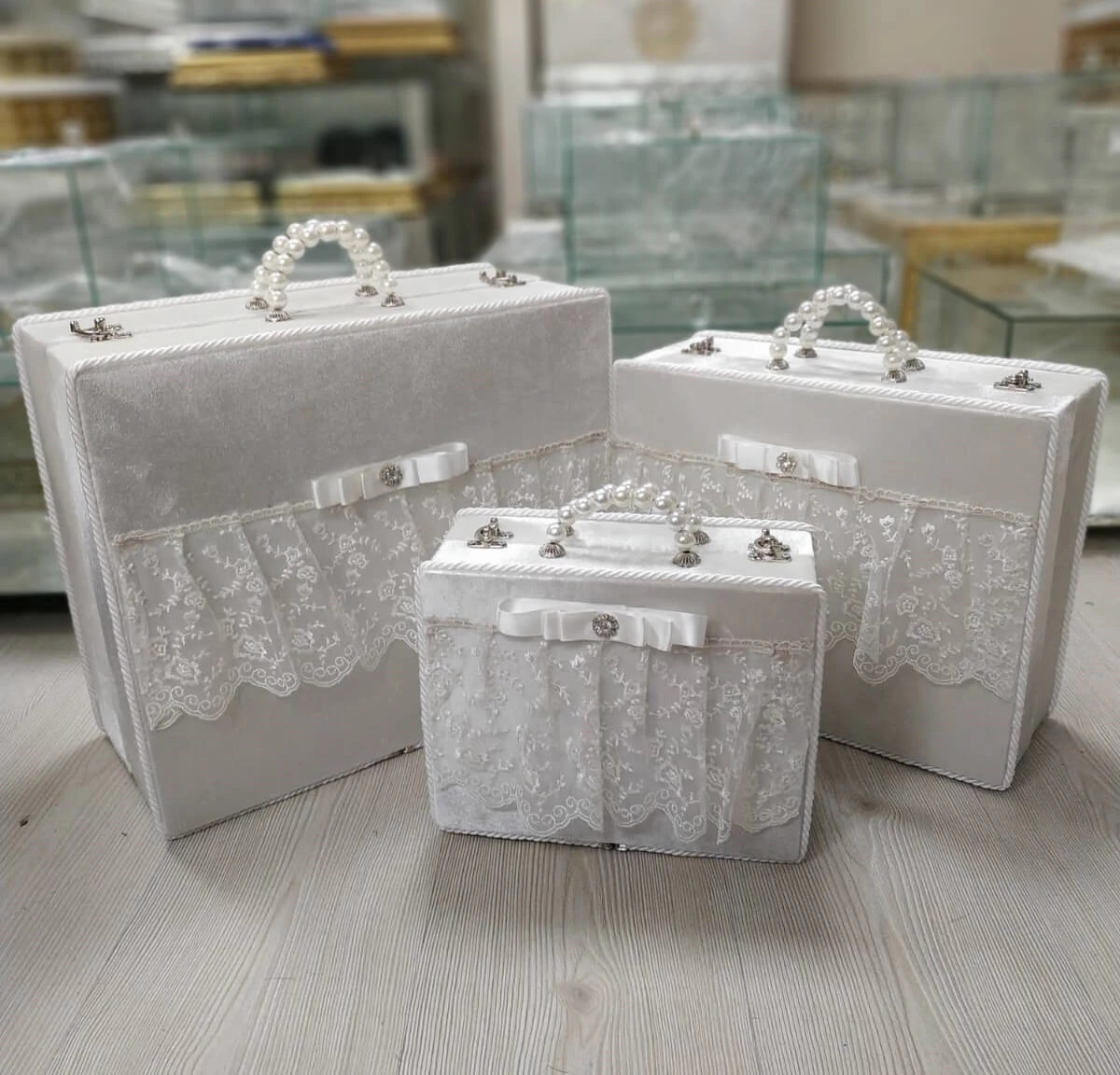 3lü Boy Güpürlü Çeyiz Gelin Çantaları Pudra