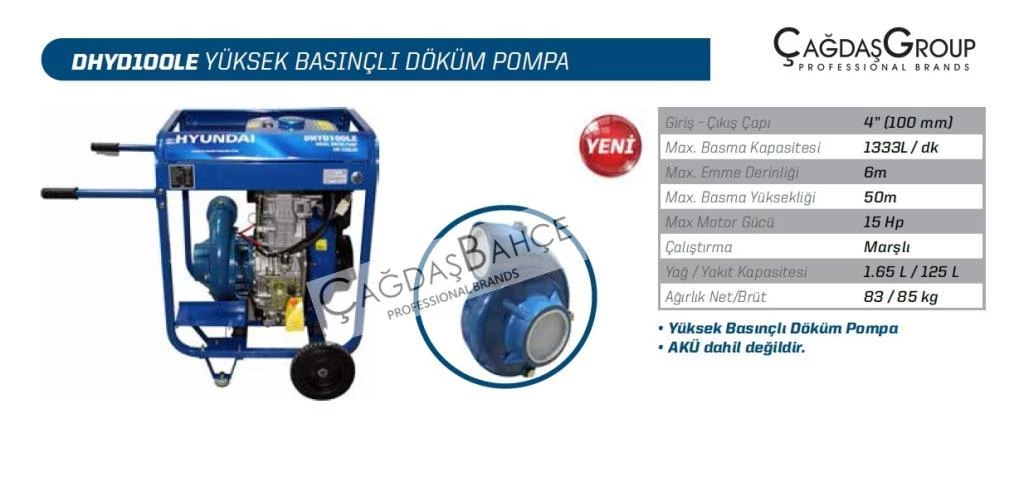 HYUNDAİ DHYD100LE 3 İNCH DİZEL MARŞLI YÜKSEK BASINÇ SU MOTORU DÖKÜM POMPA