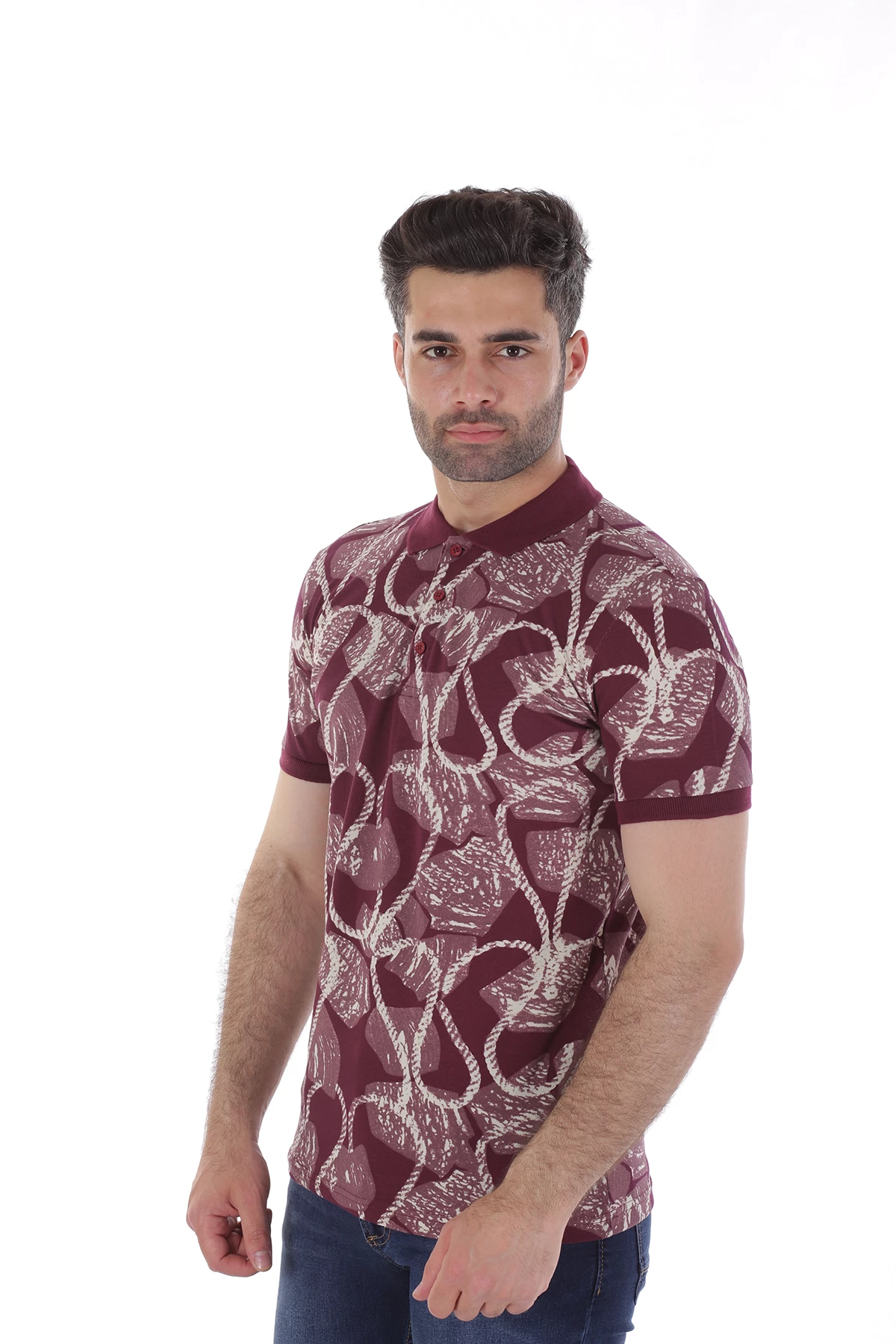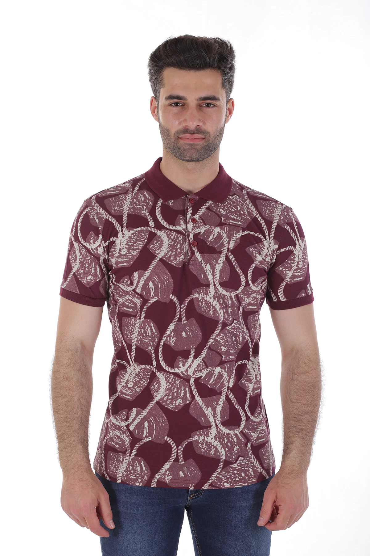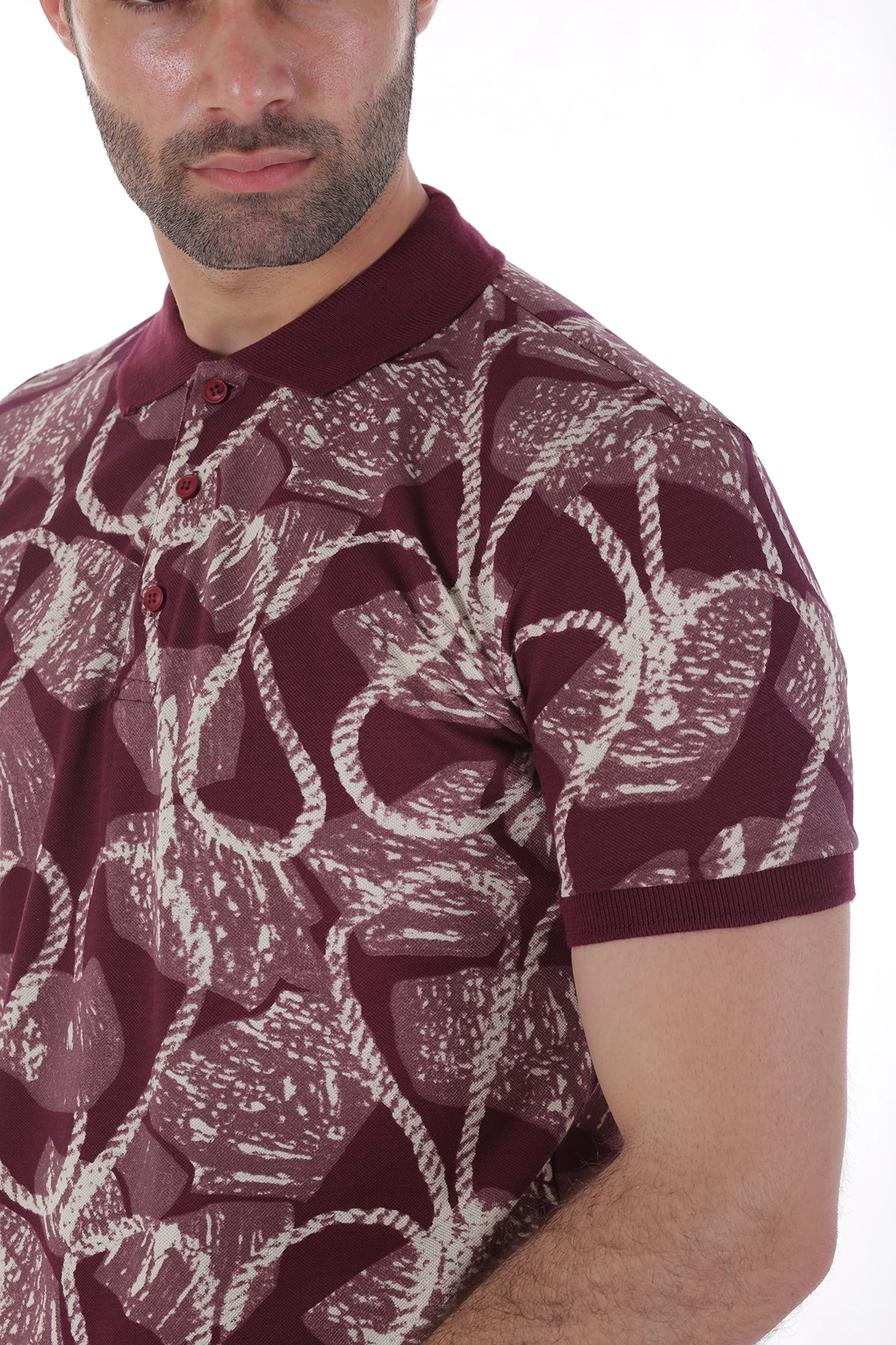 Dar kalıp,üç düğmeli,cepsiz,desenli. Yaka ve kolları farlı renk detaylı polo yaka tshirt.İçerik: %50 Pamuk, %50 Polyester. Manken ölçüleri:Kilo :75 kg/Boy : 1.85 cm/Göğüs:108 cm/Bel:82 cm/Kalça :101 cm/Beden: M
