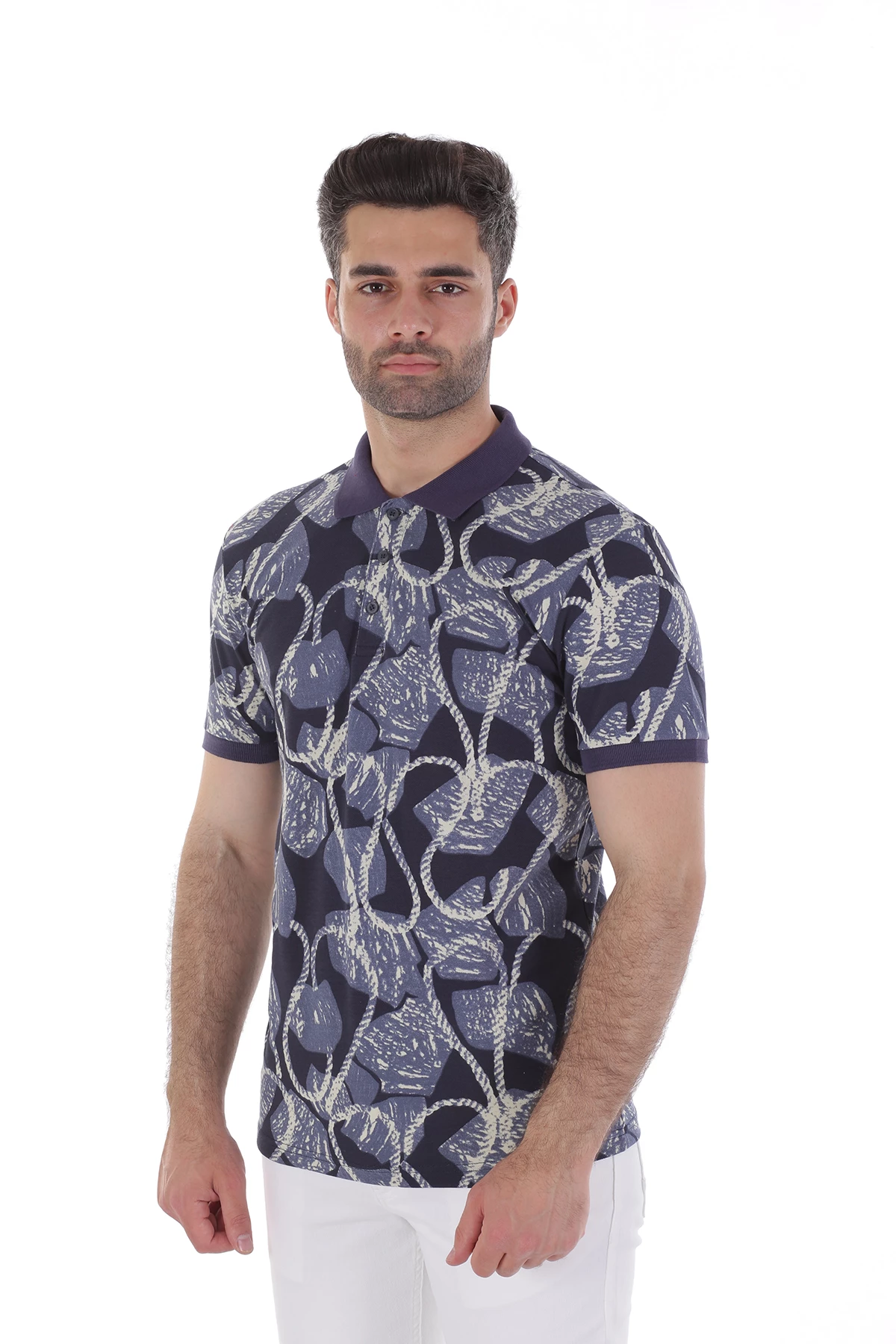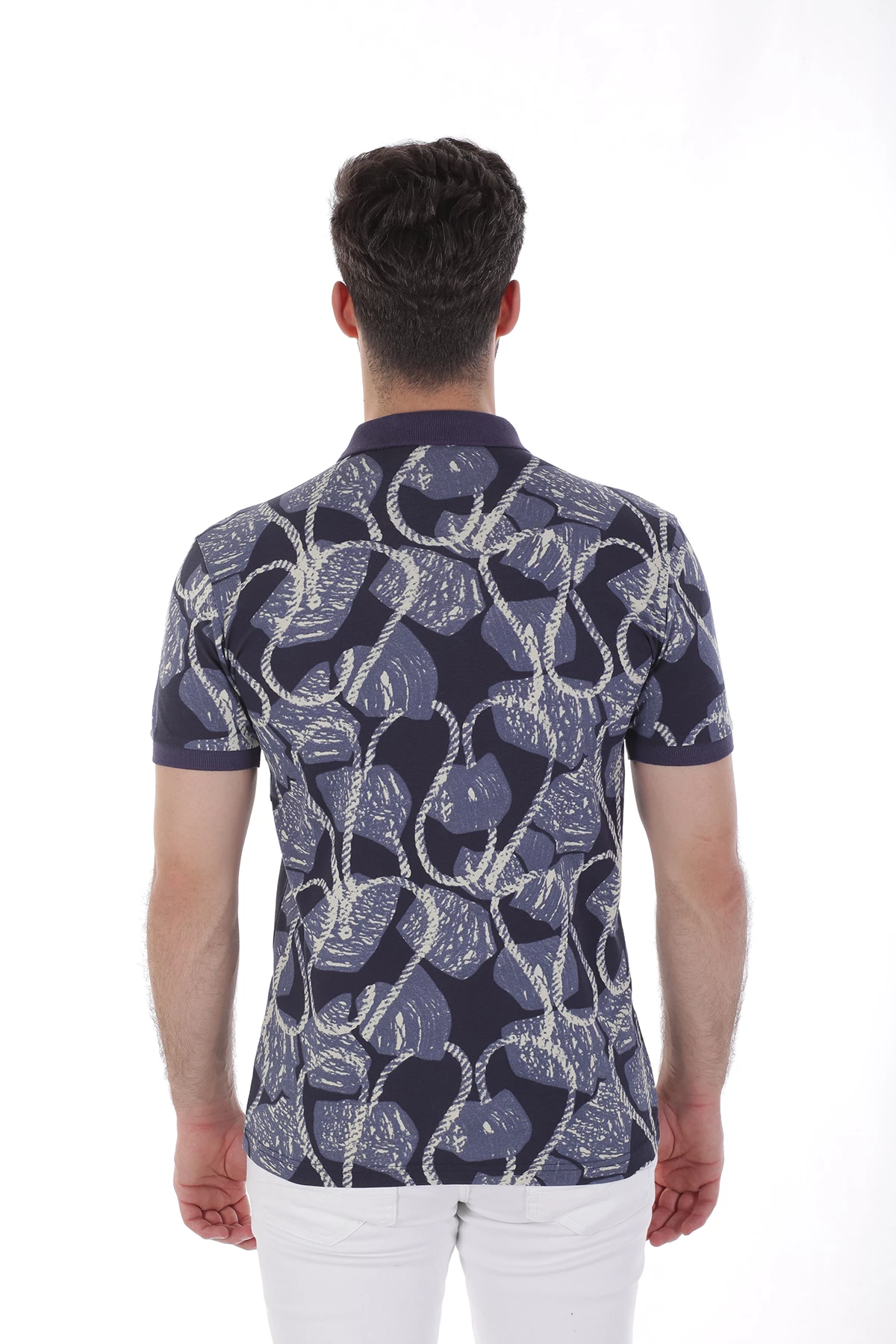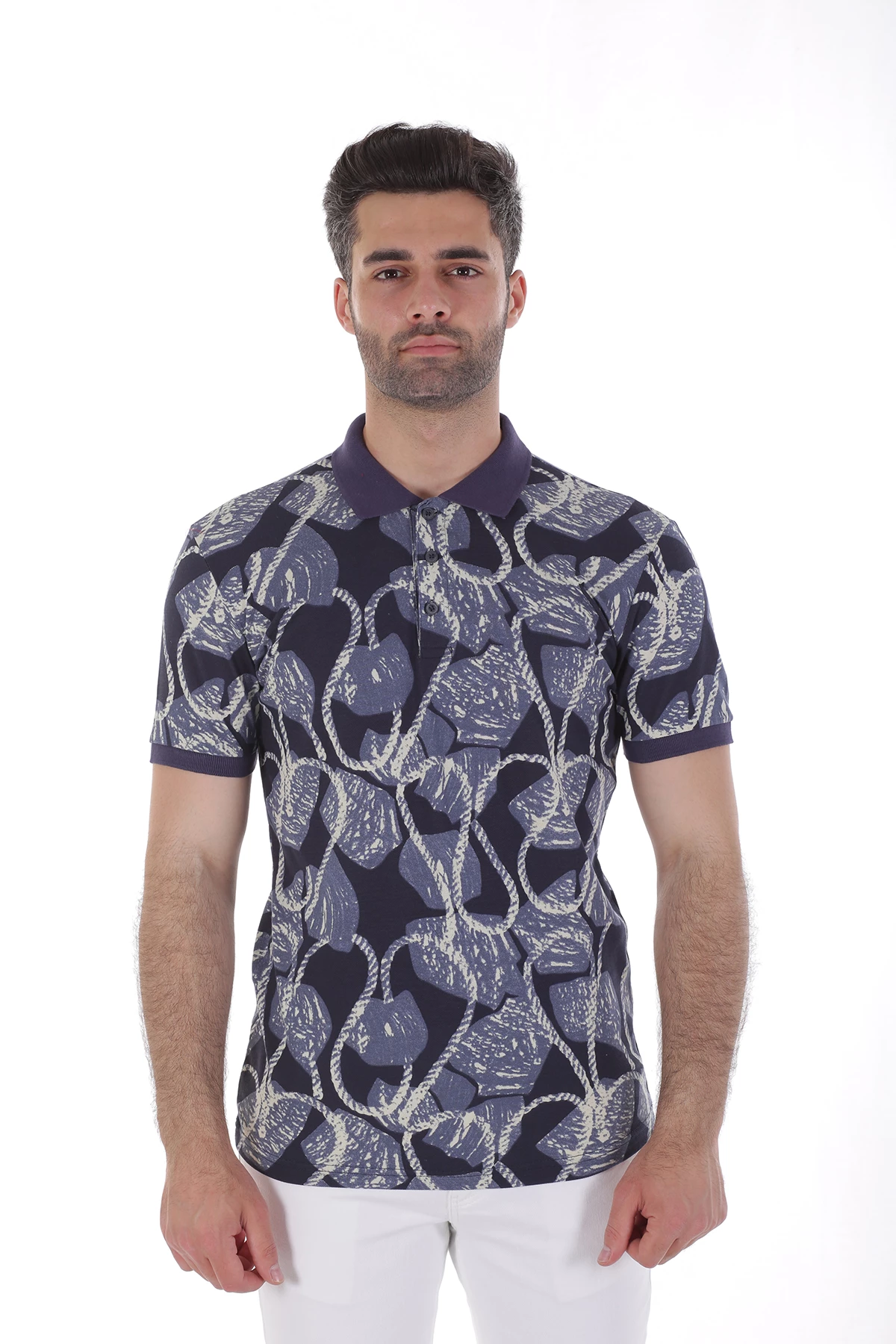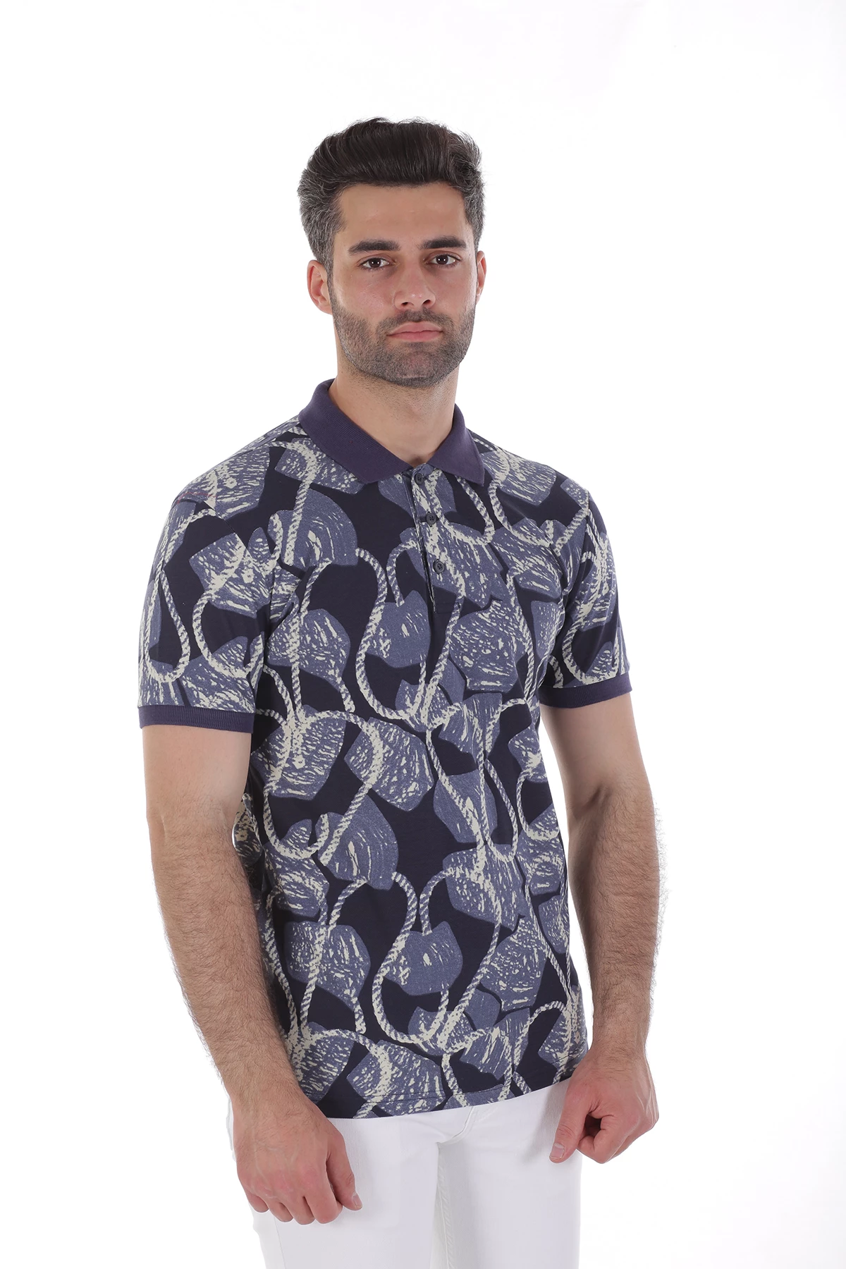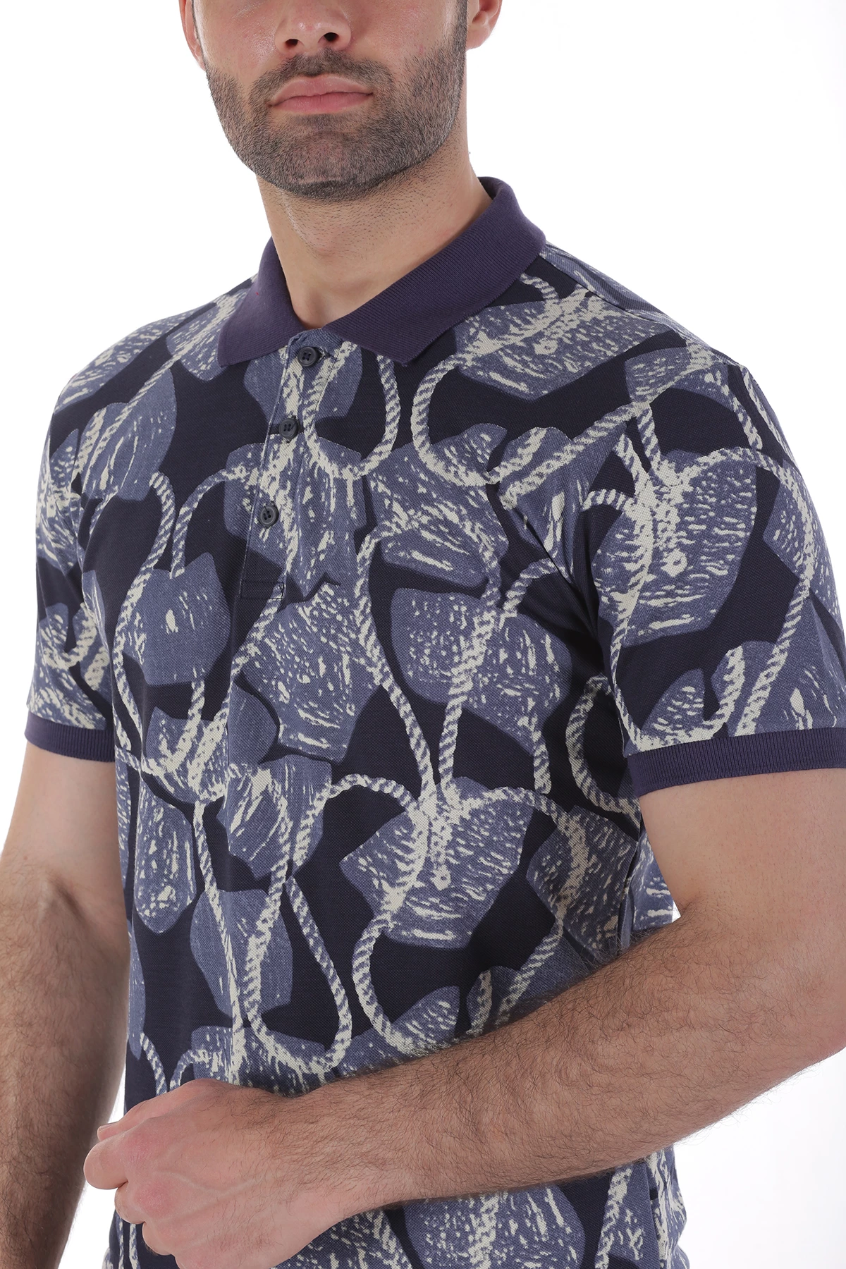 Dar kalıp,üç düğmeli,cepsiz,desenli. Yaka ve kolları farlı renk detaylı polo yaka tshirt.İçerik: %50 Pamuk, %50 Polyester. Manken ölçüleri:Kilo :75 kg/Boy : 1.85 cm/Göğüs:108 cm/Bel:82 cm/Kalça :101 cm/Beden: M