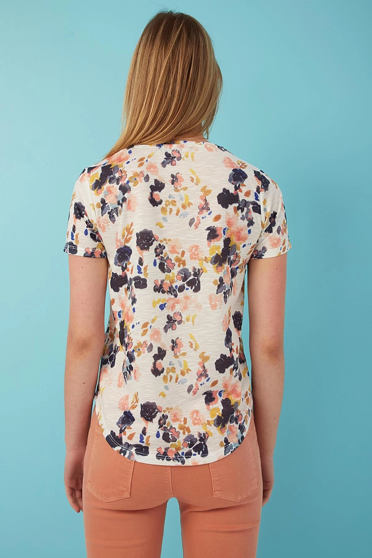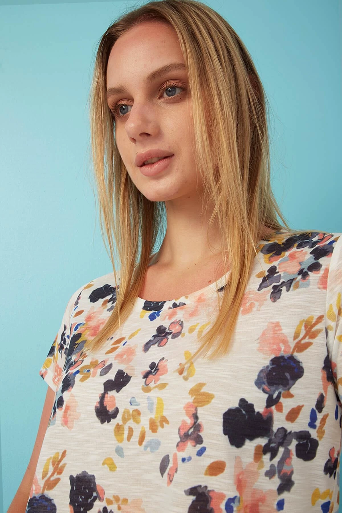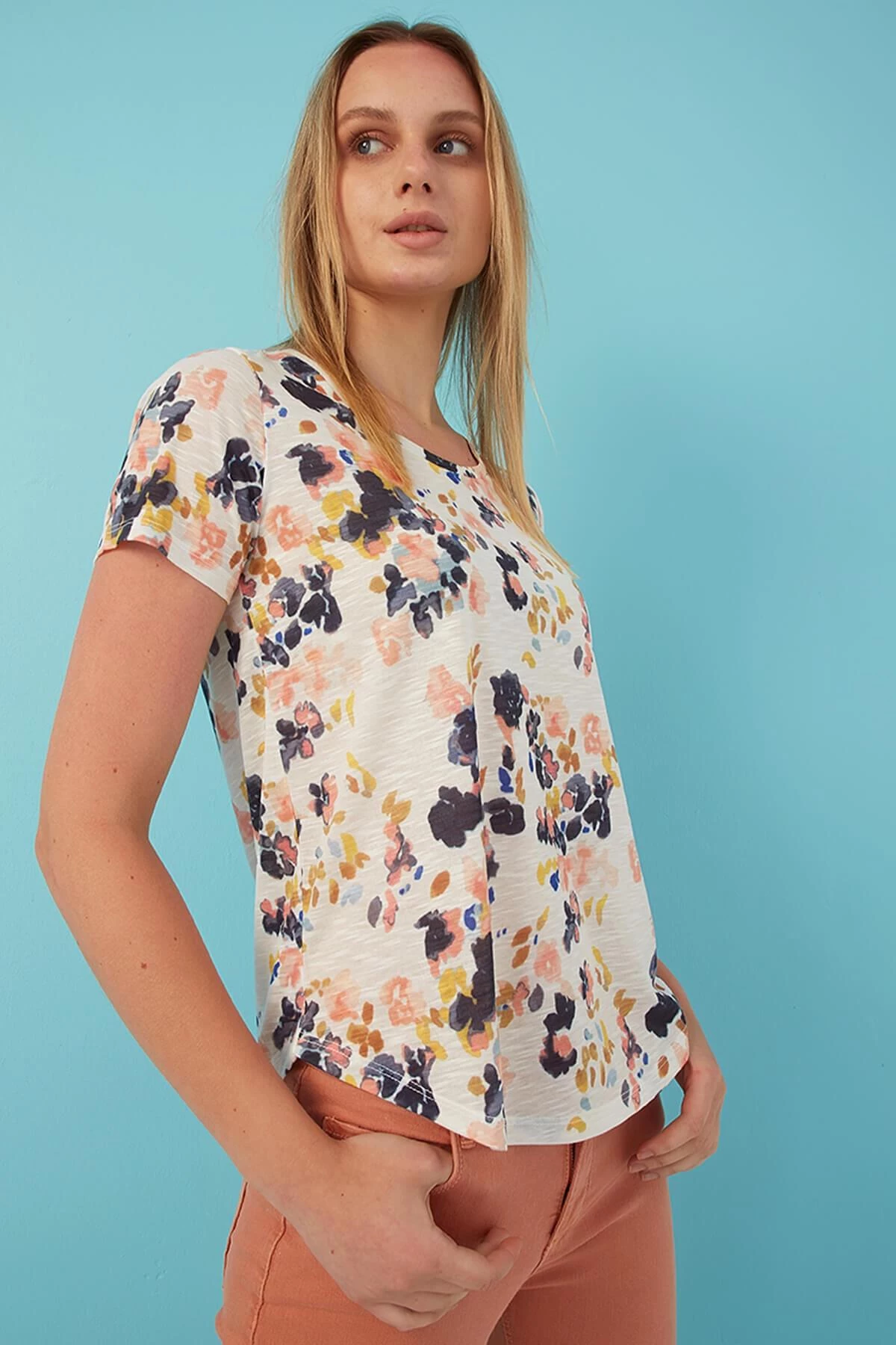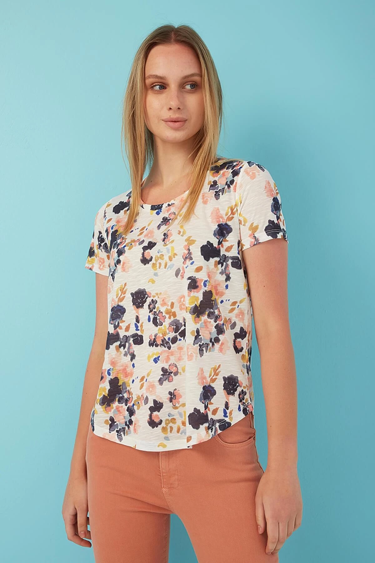 %100 Polyester Bisiklet yaka, kısa kol, standart fit, asimetrik kesim, çiiçek desen t-shirt. Model Ölçüleri:Boy:1.78, Göğüs:80, Bel:60, Basen:91 Mankenin üzerindeki ürün S/36 bedendir. Yıkama Talimatı: Ürünün iç etiket bölümünde gerekli yıkama talimatı yer almaktadır.
