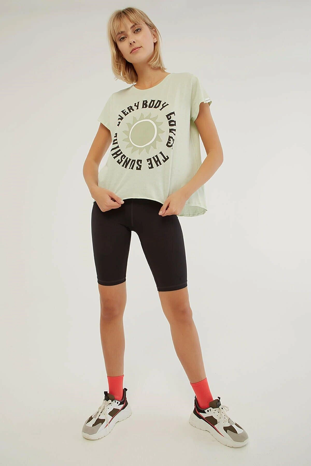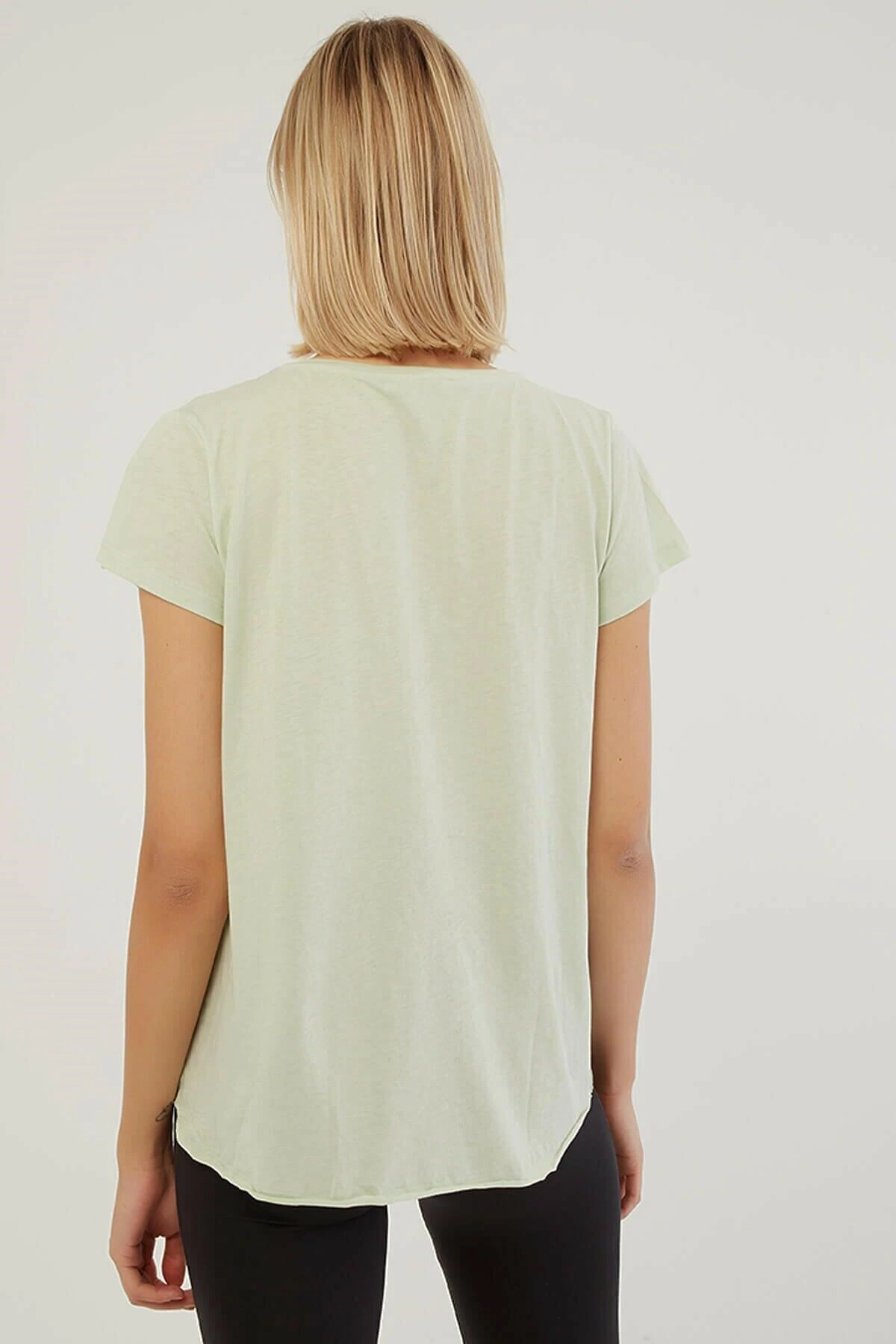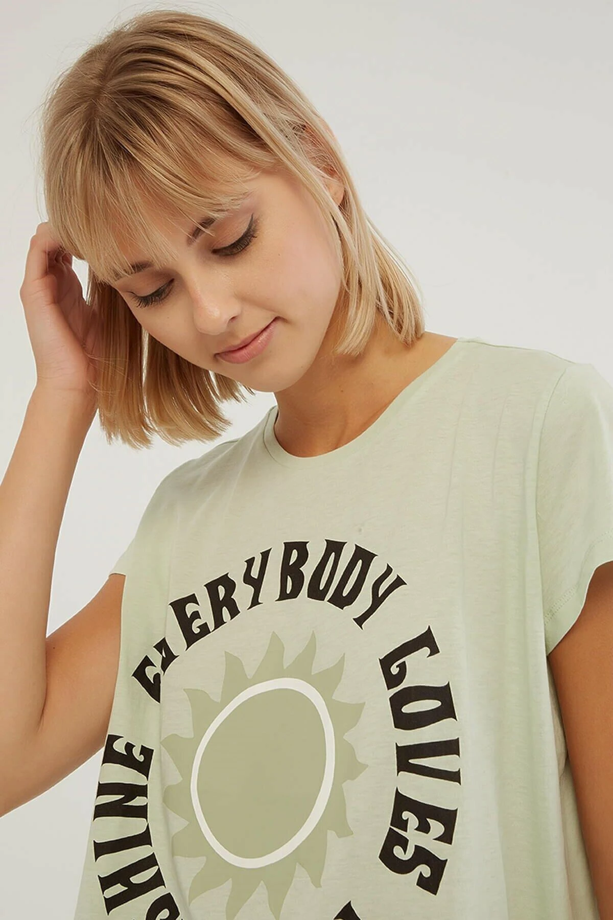 %100 Pamuk Bisiklet yaka, önü yazılı ve baskılı, asimetrik kesim t-shirt. Model Ölçüleri:Boy:1.77, Göğüs:85, Bel:62, Basen:90 Mankenin üzerindeki ürün S/36 bedendir. Yıkama Talimatı: Ürünün iç etiket bölümünde gerekli yıkama talimatı yer almaktadır.