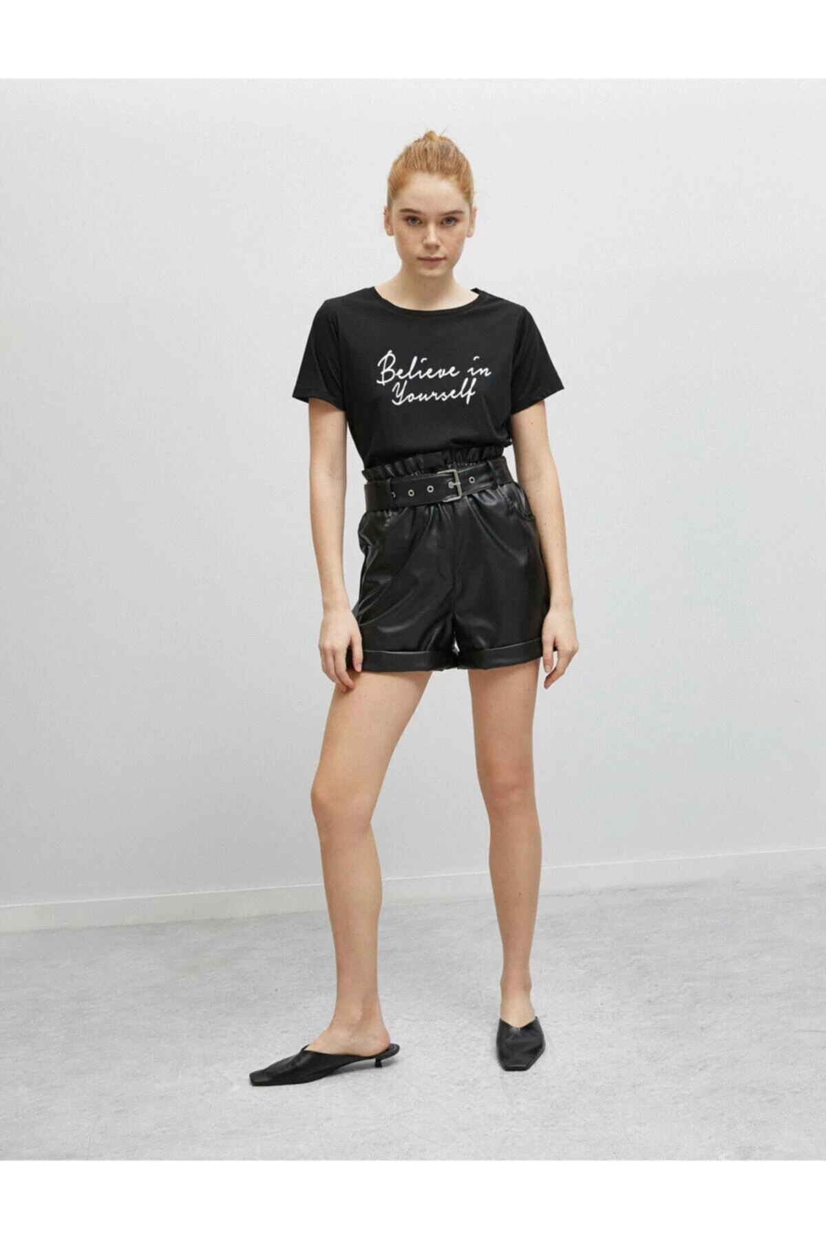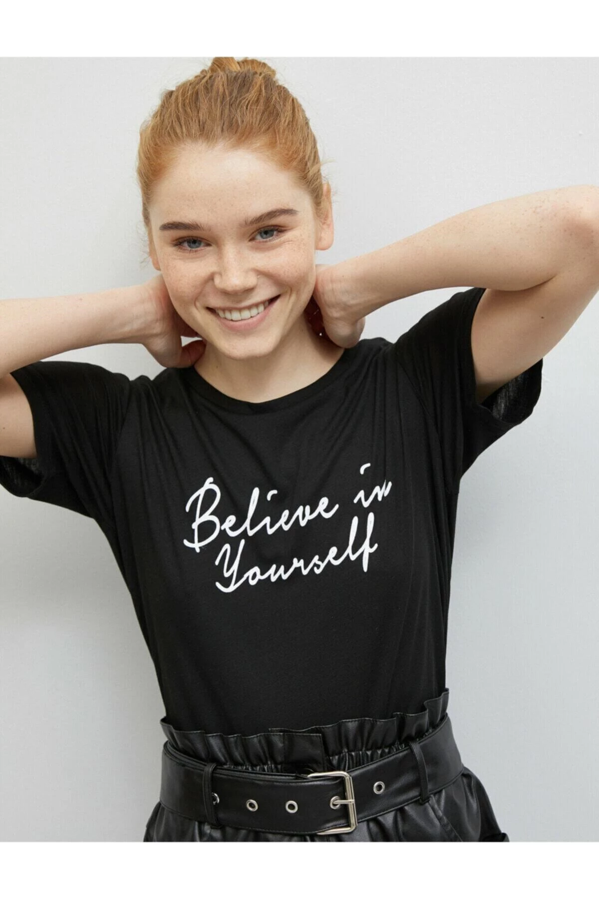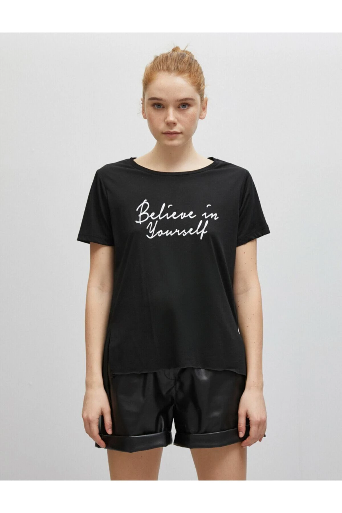 Kısa kollu, yazılı baskılı tişört Manken ölçüleri:Boy: '175'göğüs çevresi: '81'bel genişliği: '60'kalça genişliği: '88' Materiel:%65 polyester, %35 viskoz