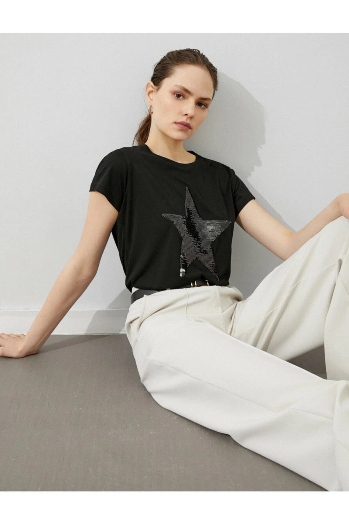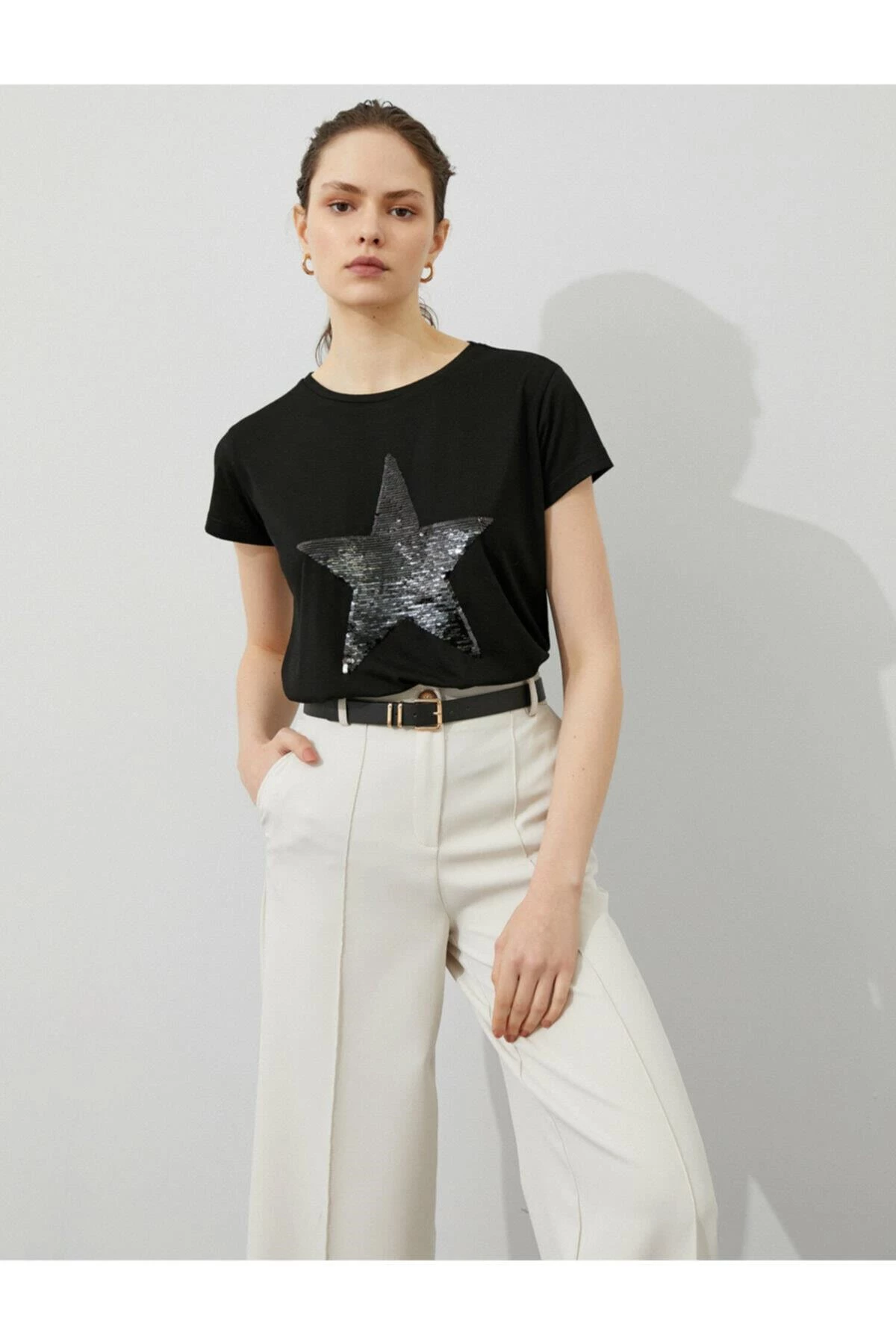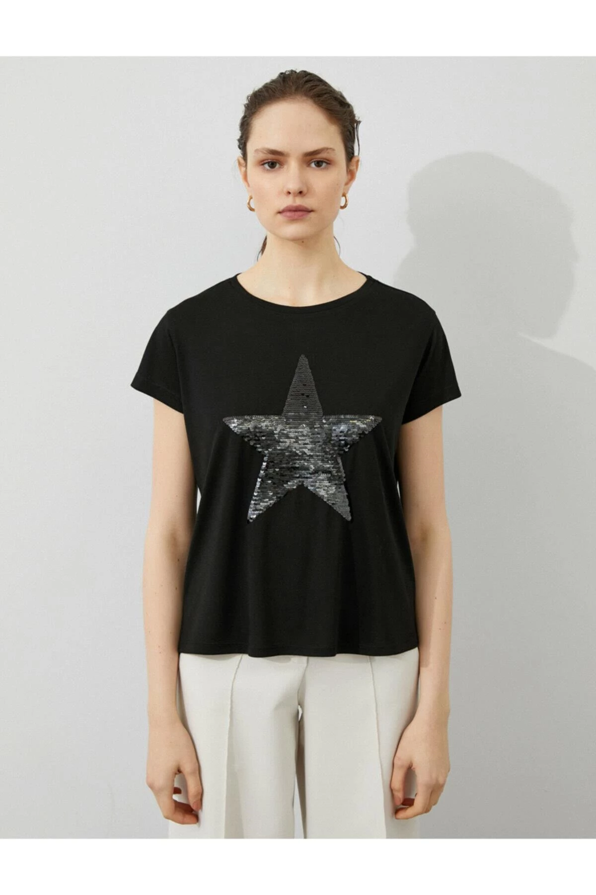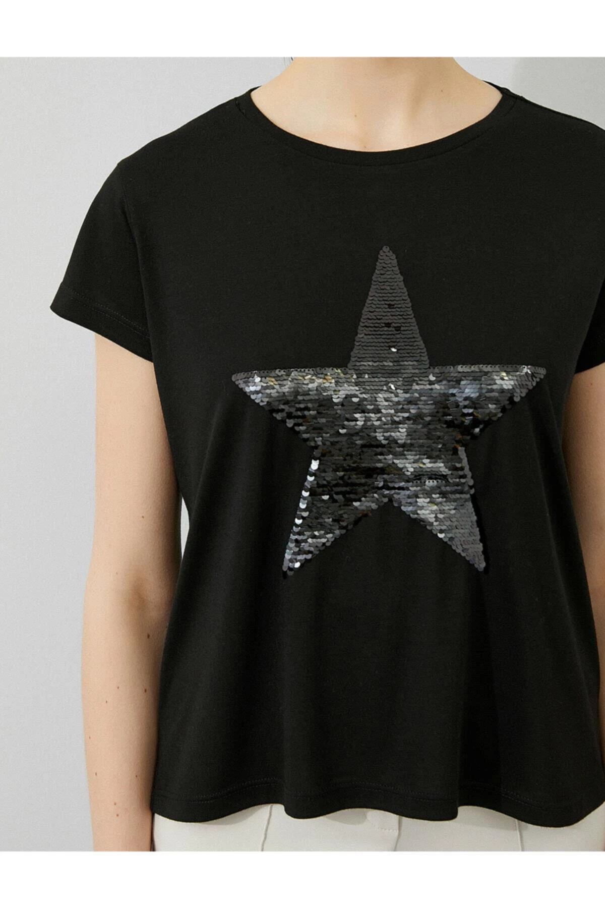 Needion - Koton Kadın Siyah Pullu Kısa Kollu Tshirt  SİYAH XXL
