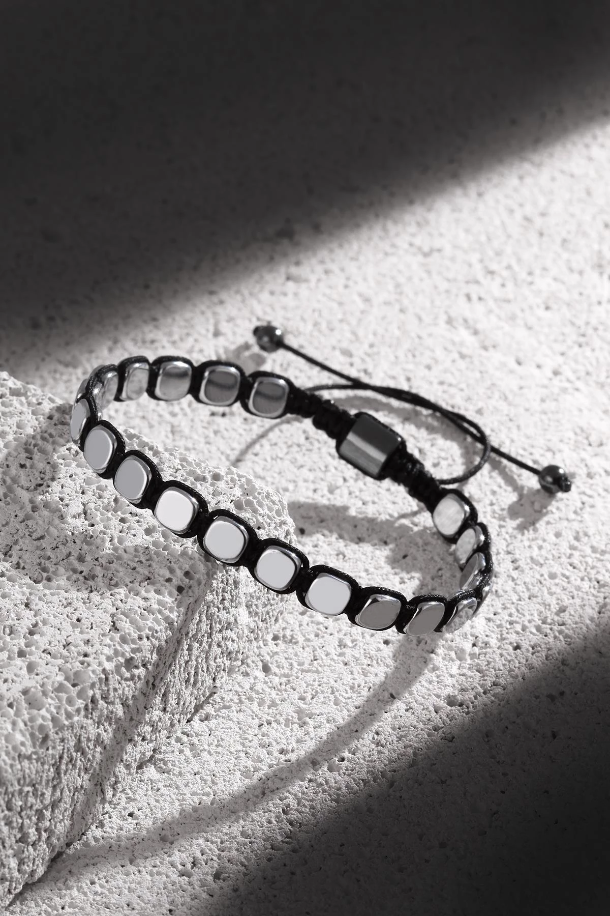NOON Hematit Taşlı Gümüş Renkli Siyah İpli El Yapımı Ayarlanabilir Erkek Makrome Bileklik NN1381