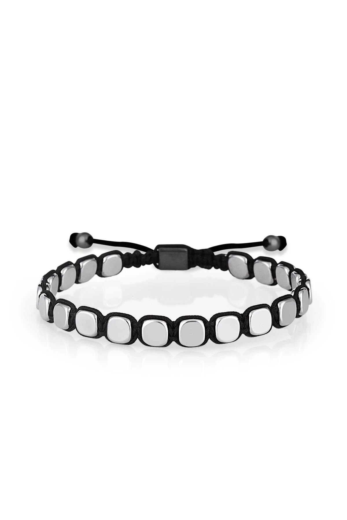 Needion - NOON Hematit Taşlı Gümüş Renkli Siyah İpli El Yapımı Ayarlanabilir Erkek Makrome Bileklik NN1381