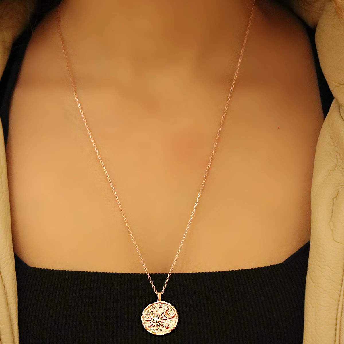 Ay ve Güneş Figürlü Madalyon 925 Ayar Gümüş Kolye
