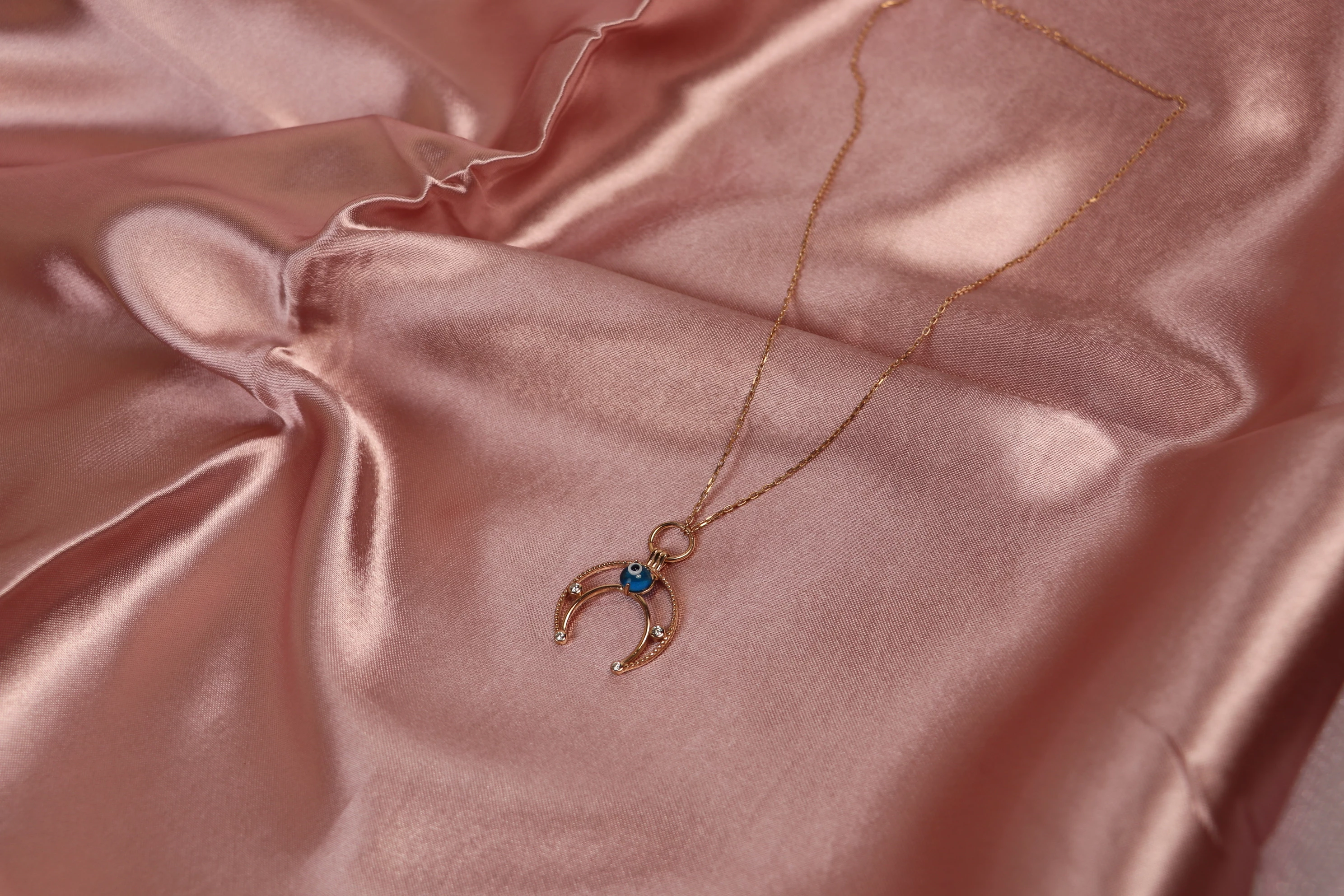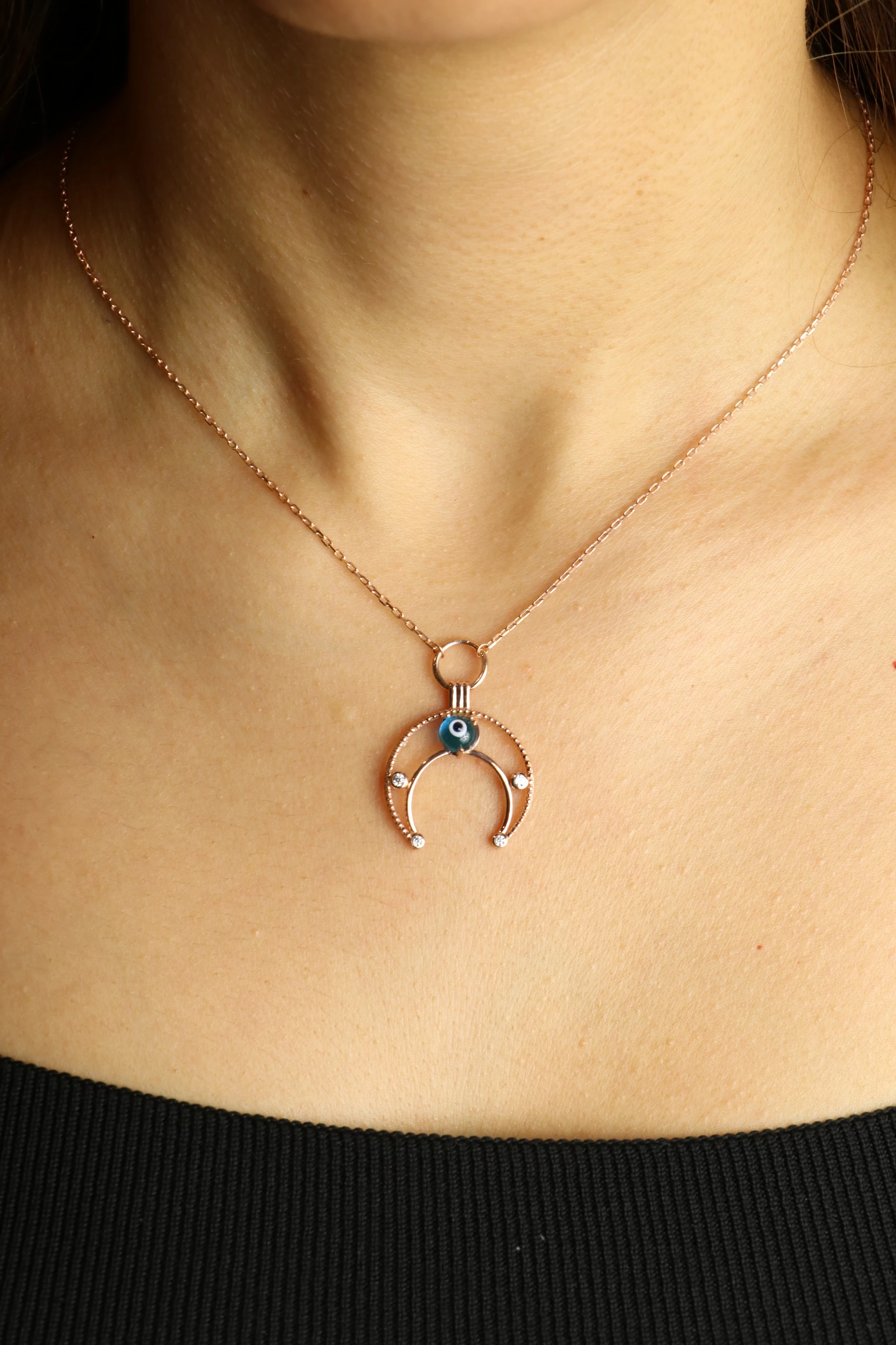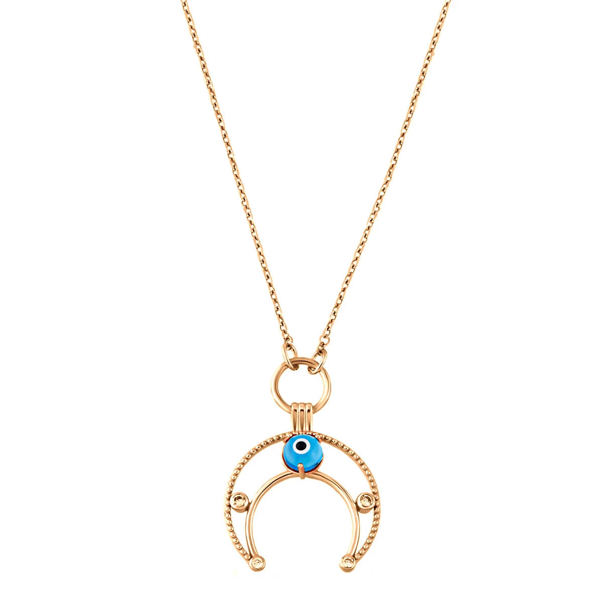 Needion - Nazar Boncuklu Hilal Formlu Kolye Zirkon Rose Altın Kaplama 925 Ayar Gümüş