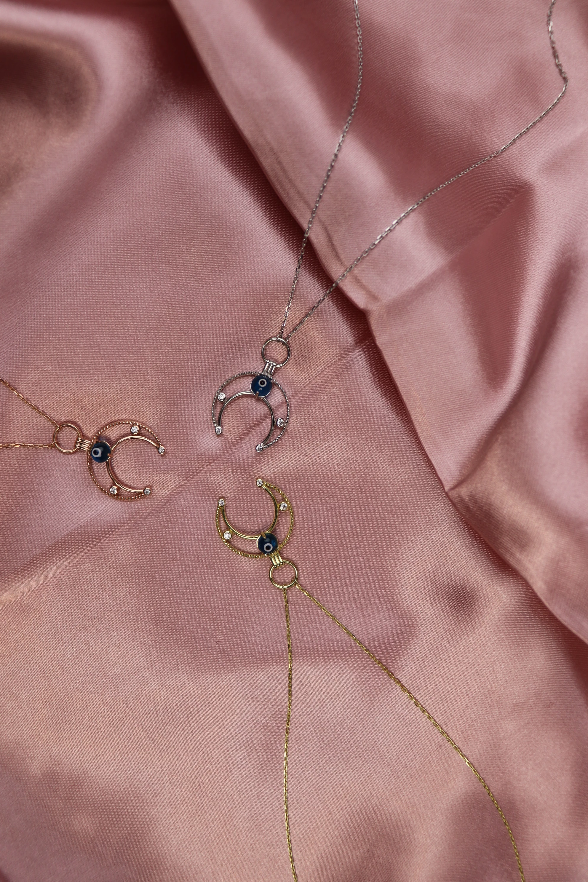 Nazar Boncuklu Hilal Formlu Kolye Zirkon Rose Altın Kaplama 925 Ayar Gümüş