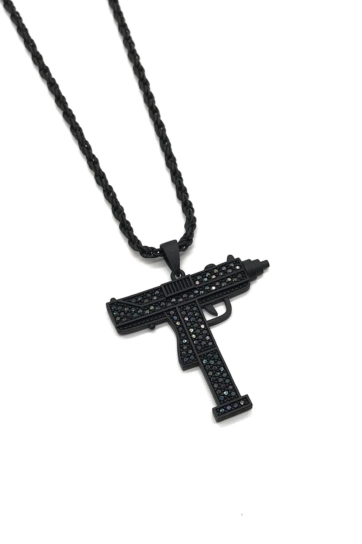 Needion - NOON Uzi Figürlü Siyah Zirkon Taşlı Mat Siyah Renkli Zincirli Erkek Kolye NN30430-530-B2