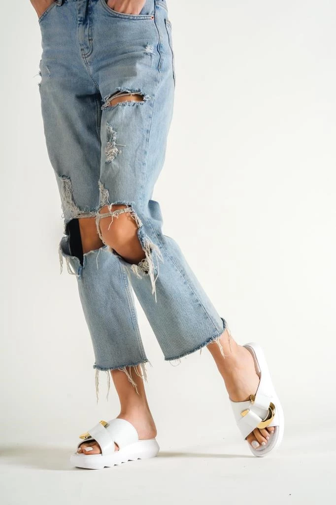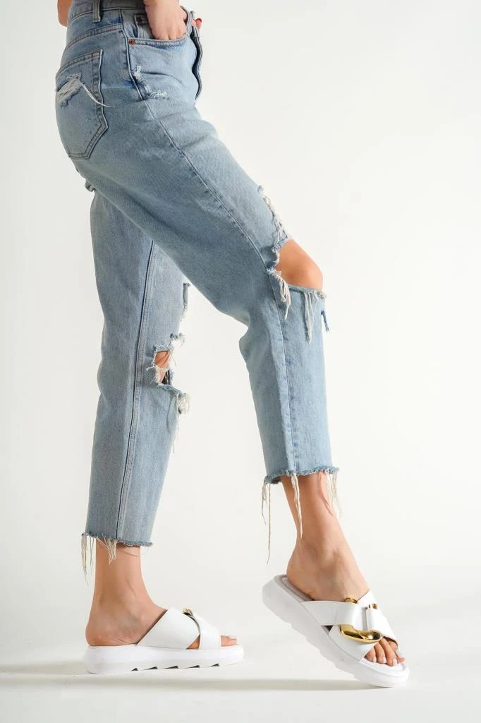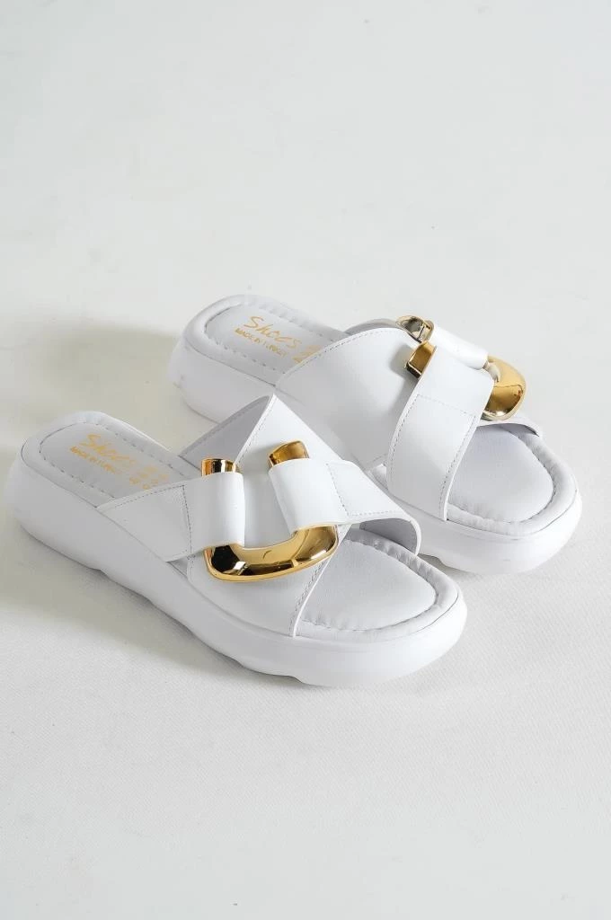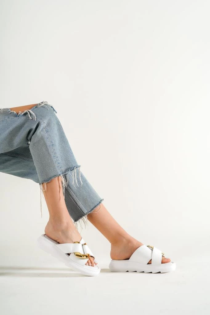 Bayan Beyaz Brelna Toka Detaylı Yumuşak Taban Terlik
