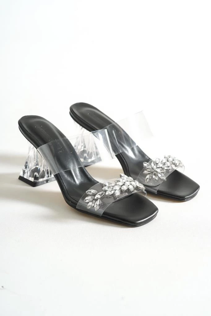 Needion - Bayan Rose Siyah Yüksek Burgu Şeffaf Topuk Şeffaf Bant Yaprak Taş Detaylı Terlik SİYAH 39