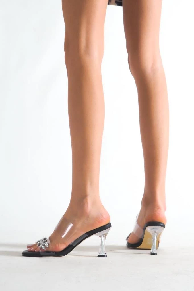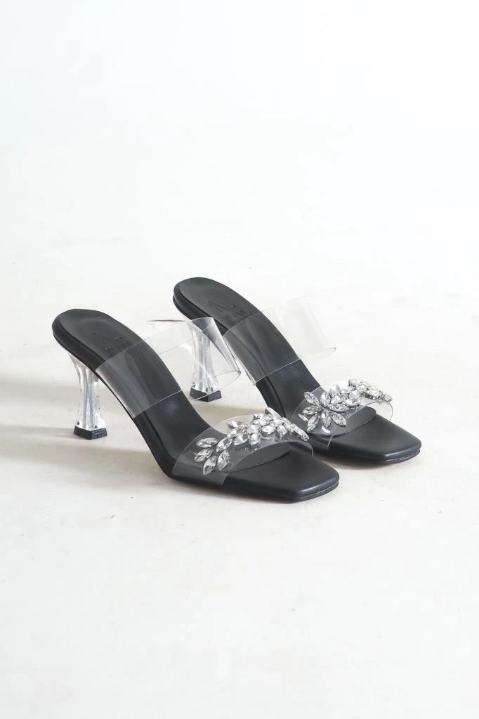 Bayan Siyah Şeffaf Şampanya Topuk Şefaf Bantlı Yaprak Taş Detaylı Terlik Al-01