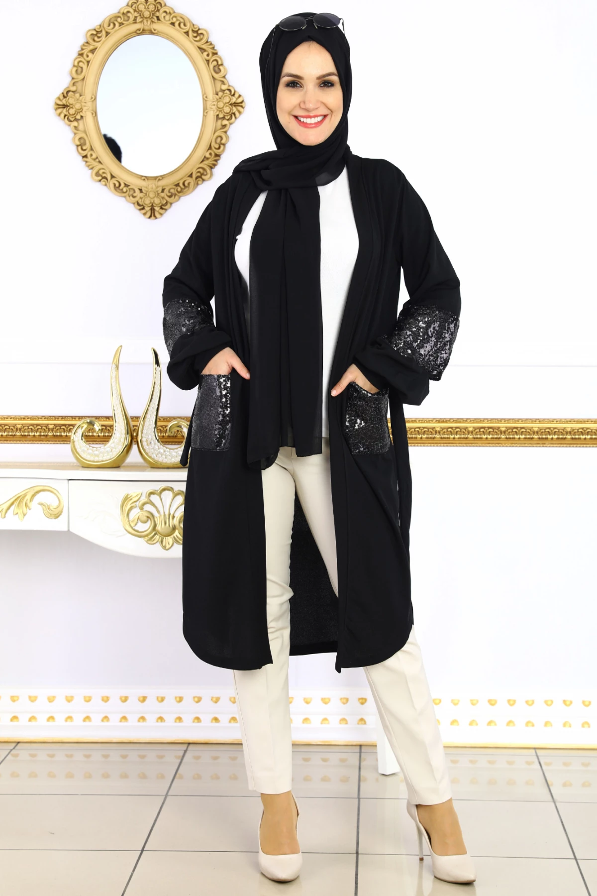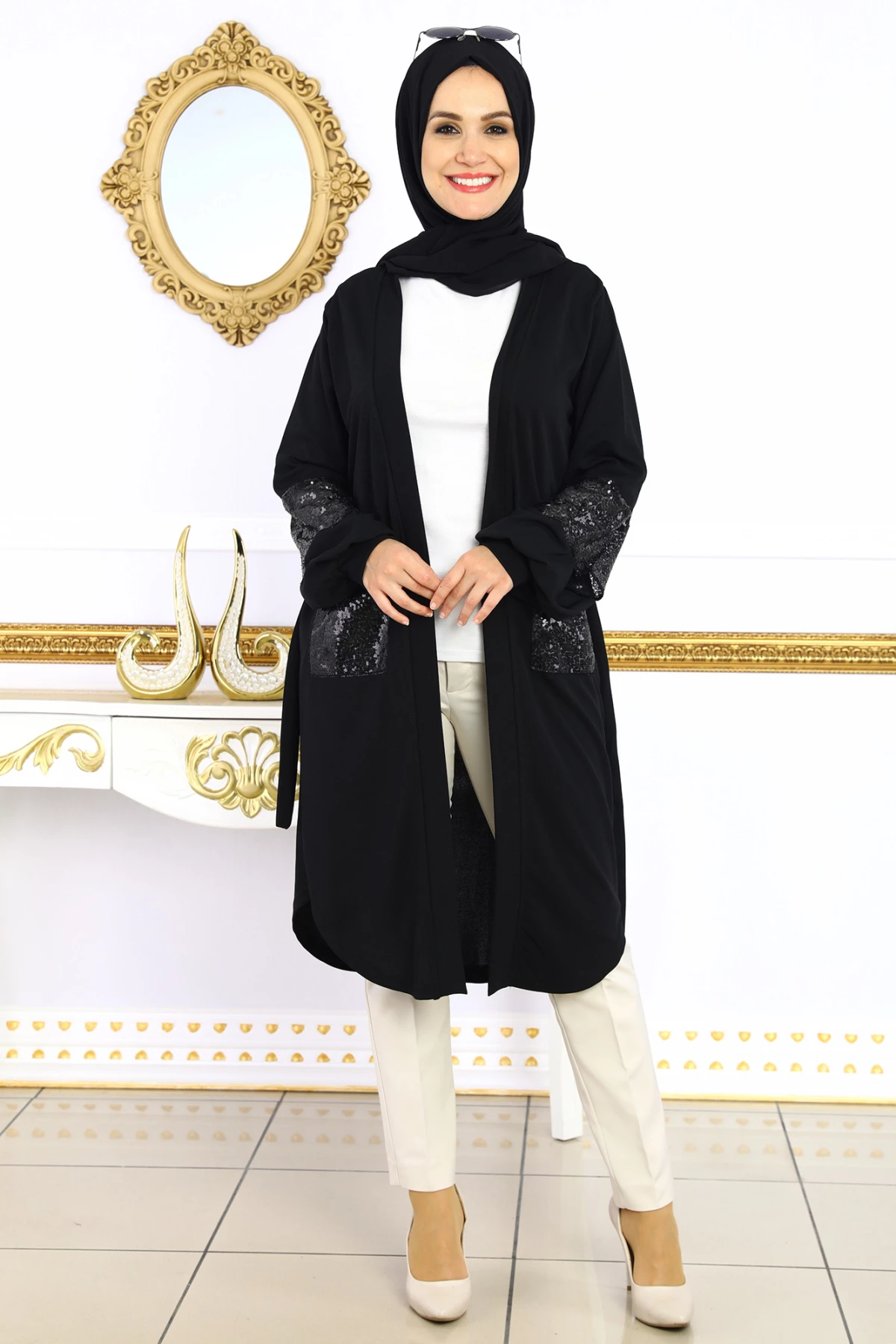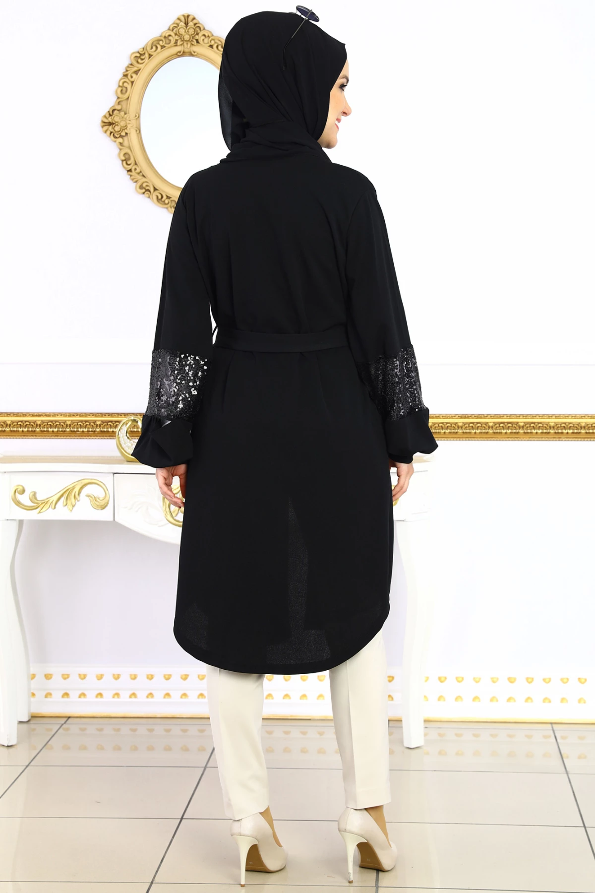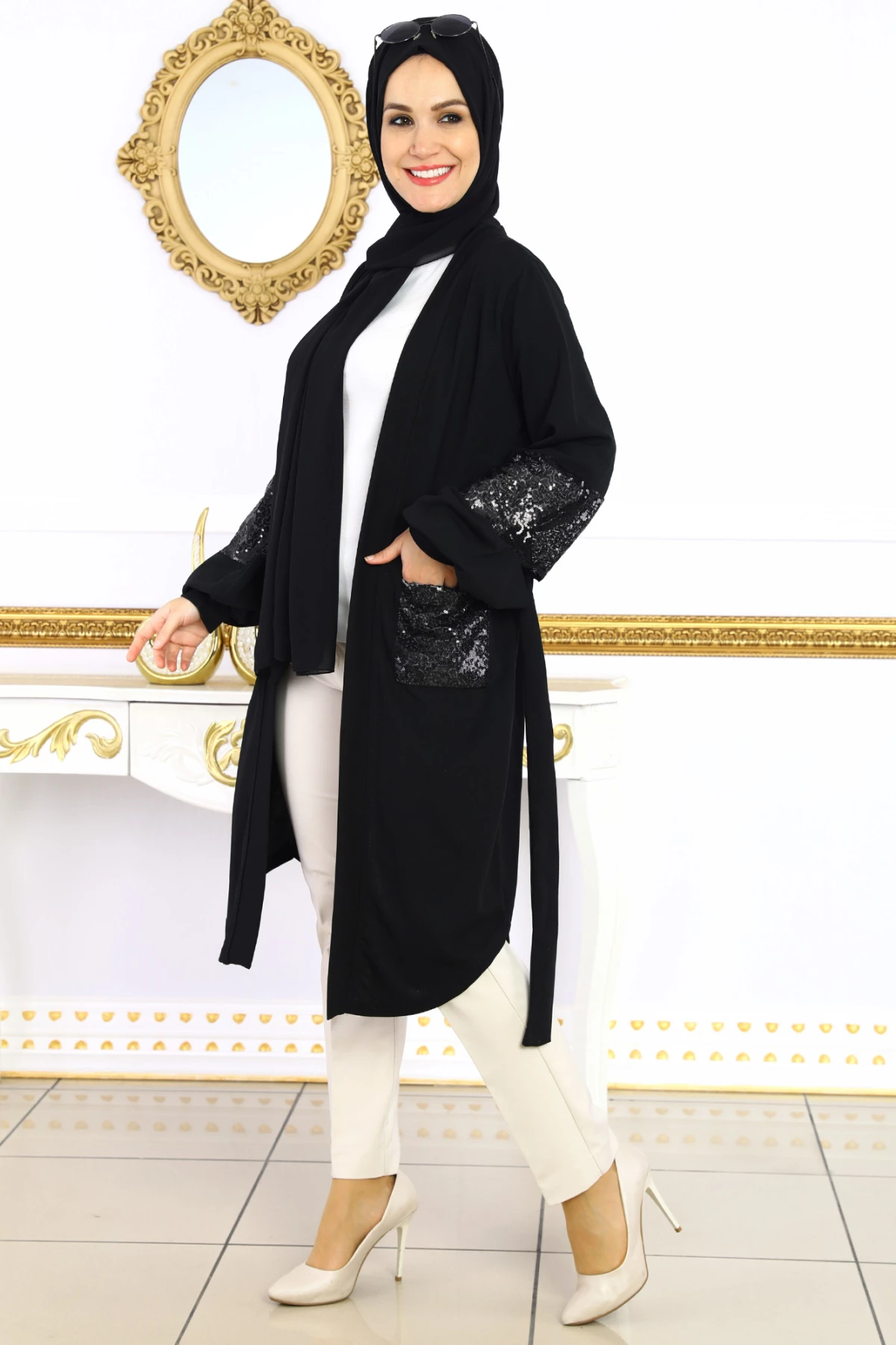 Needion - Belden Bağlamalı Pul Payet İşlemeli Tesettür Ceket Siyah S (36)