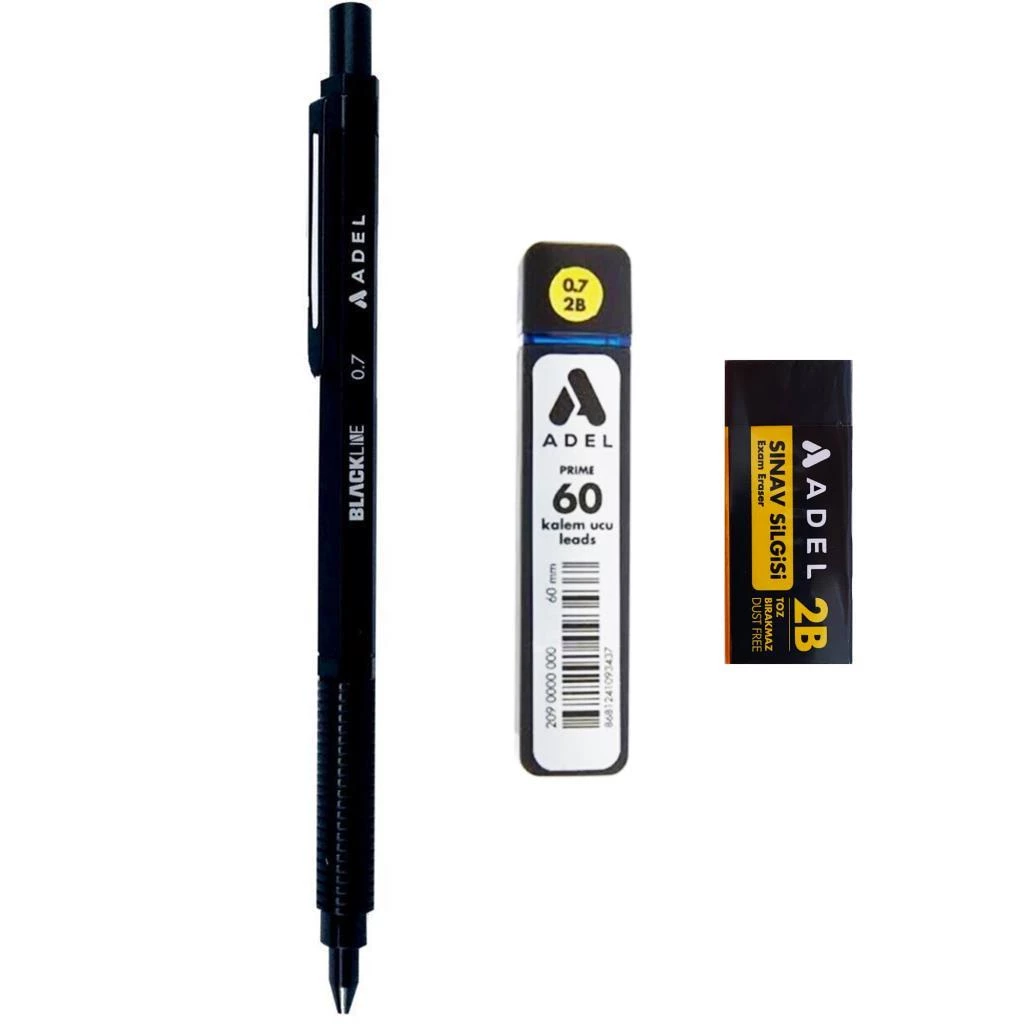 Adel Blacklıne Metal Gövdeli Versatil Kalem Siyah-Siyah 0.7 + Adel 0,7 Uç 60'lı + Silgi